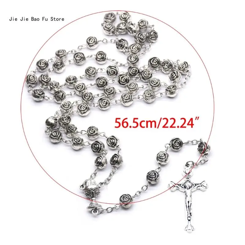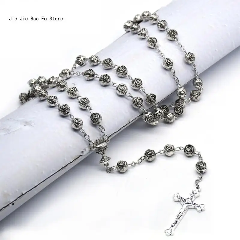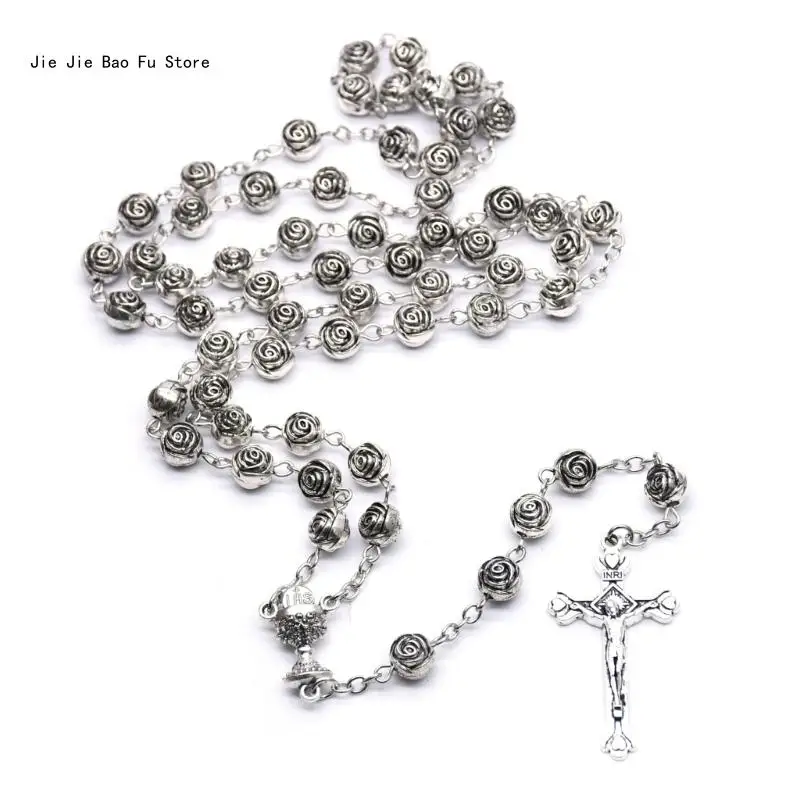 Catholic Rosary Necklace Plastic Rose Flowers Bead Cross Crucifix Pendant Vintage Religious Jewelry for Women Meditation