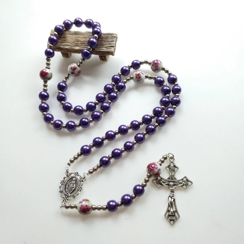 Handmade Glass Bead Rosary Catholic Necklace for Women Girls Jewelry Jesus for Cross Pendant Religious Prayer Necklaces Y5GB