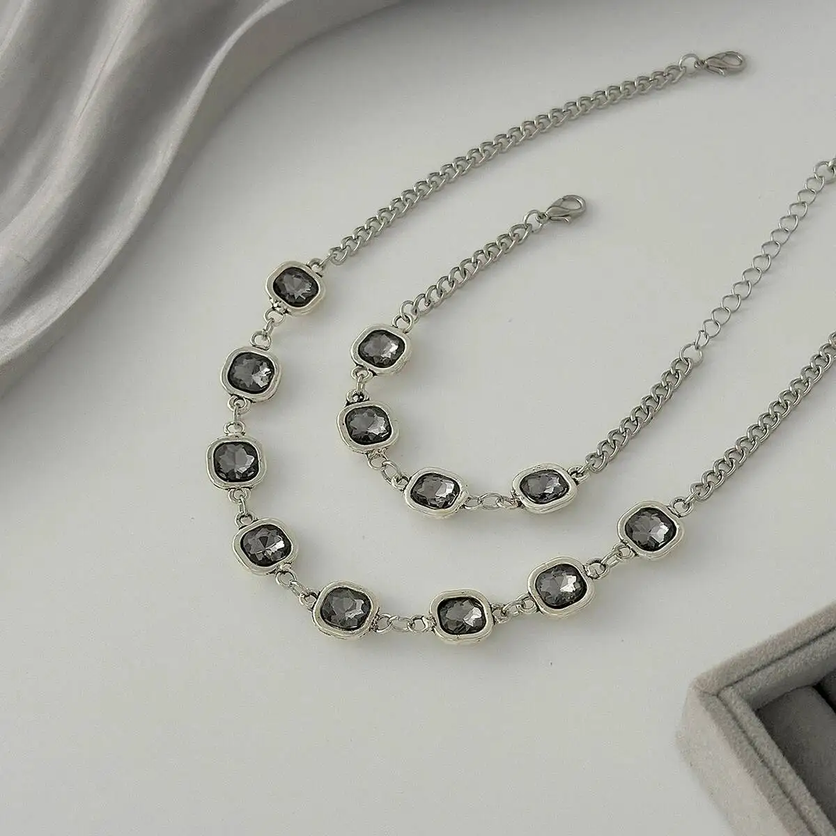 Featuring square rhinestones in a chic black finish, this necklace and bracelet set exudes sophistication and charm.